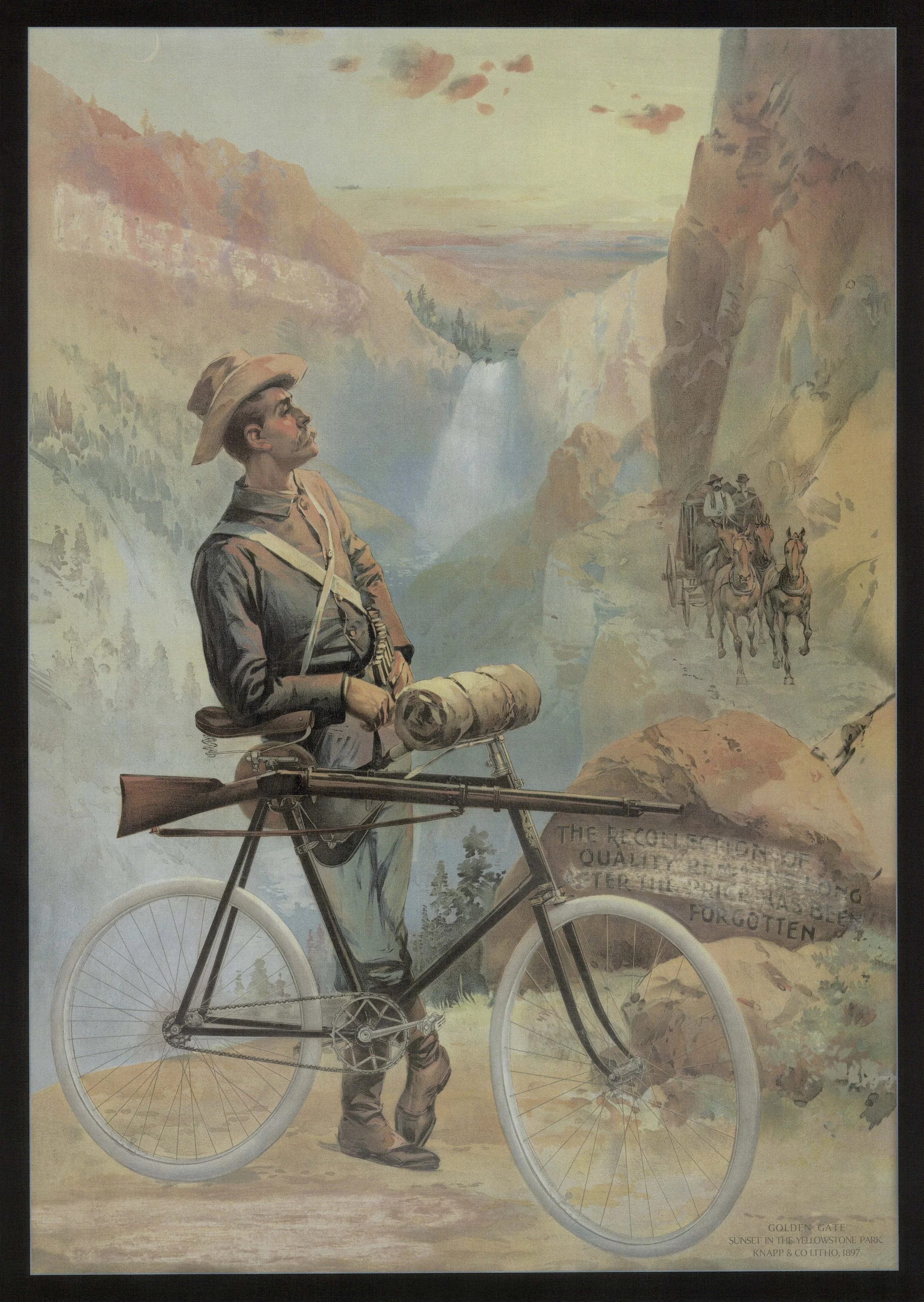 In the foreground, a soldier rests against a bicycle. He wears the standard Army uniform worn in the parks during this era: a dark blue wool shirt, sky-blue trousers, canvas leggings, and shoes. Though unnamed, the man in the image bears a strong resemblance to photographs of Captain Moses Harris, the first military superintendent of Yellowstone National Park. The text on the stone reads: “The recollection of quality remains long after the price has been forgotten.” In the early days of the park, poachers and souvenir hunters posed a serious threat to the natural resources of the area. The US Army established a presence at Camp Sheridan, at the base of the Mammoth Hot Springs Terraces, in 1886 to help manage and protect the land. The first buildings of Fort Yellowstone were finished in late 1891. The bicycle in the image could be a nod to the volunteer Bicycle Corps of the 25th Infantry Regiment, who rode more than 300 miles from Fort Missoula to Fort Yellowstone in August of 1896.